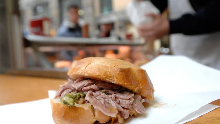 A Florence street vendor preparing Lampredotto – tender stewed tripe piled into a crusty bun. This classic street food sandwich is a Florentine favorite that proves some of the best food in Florence Italy is found in the most humble places.